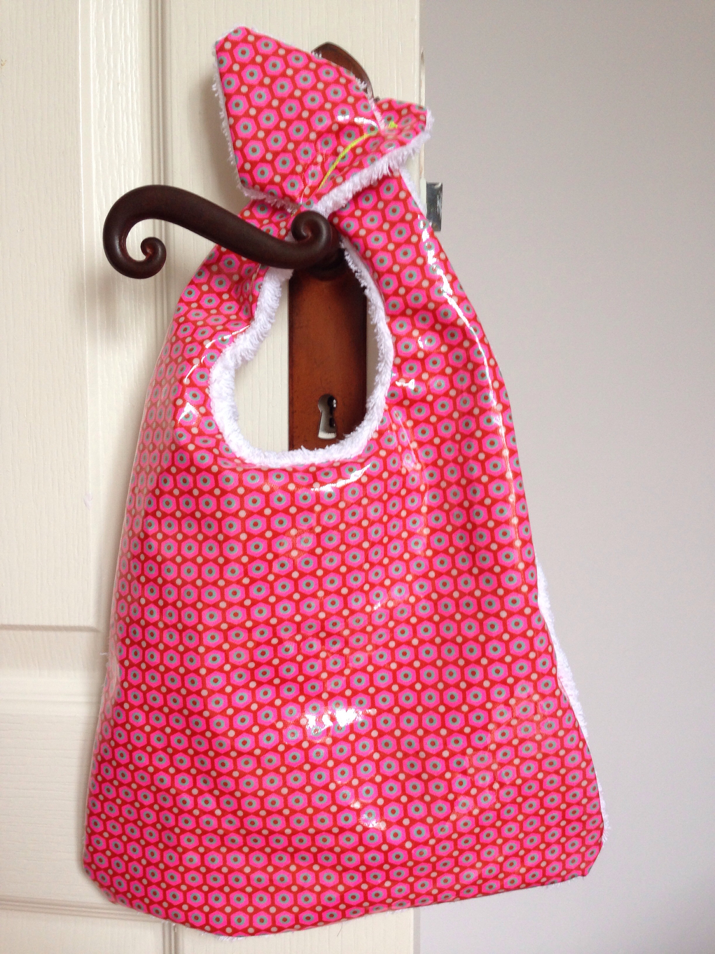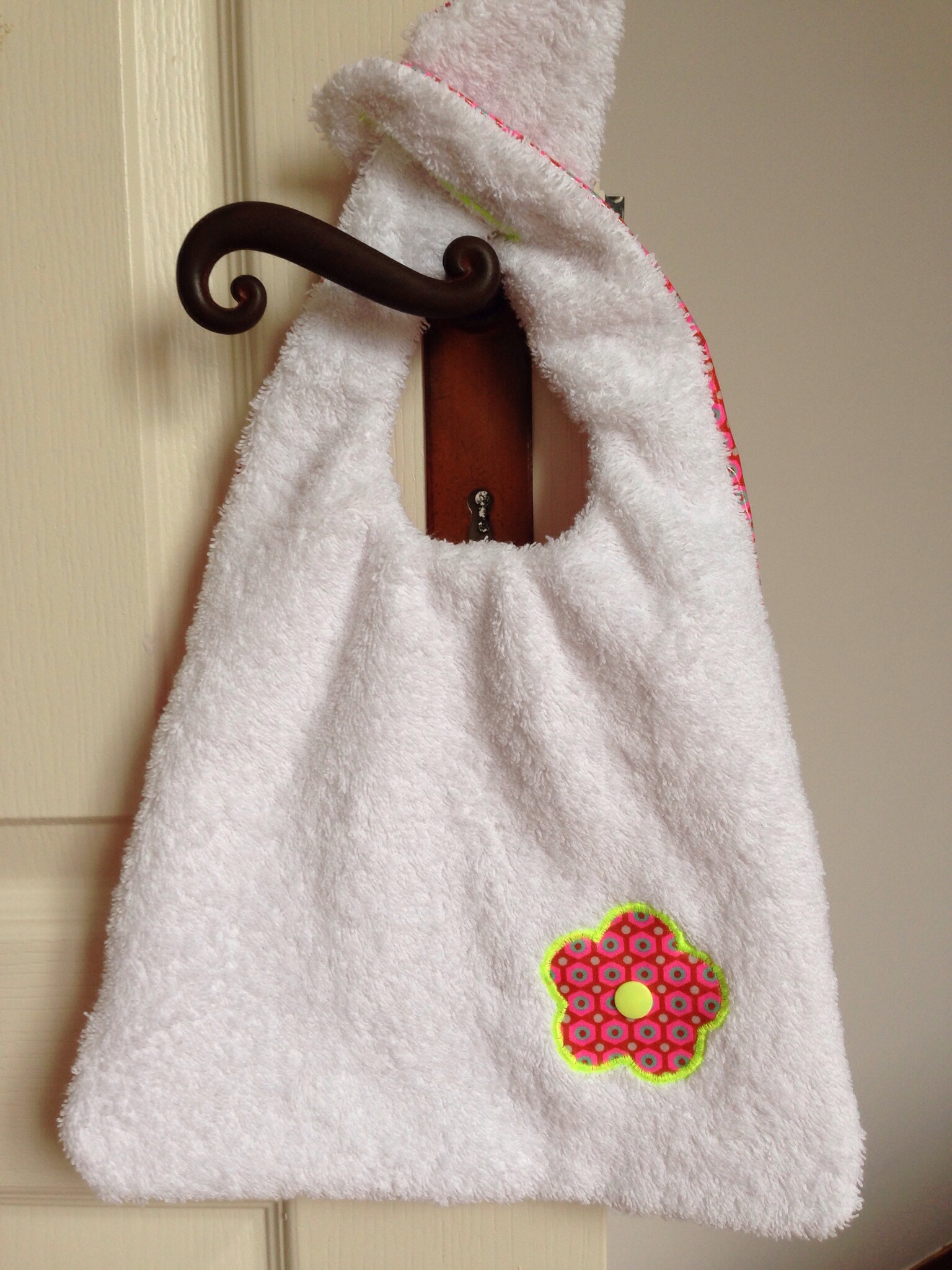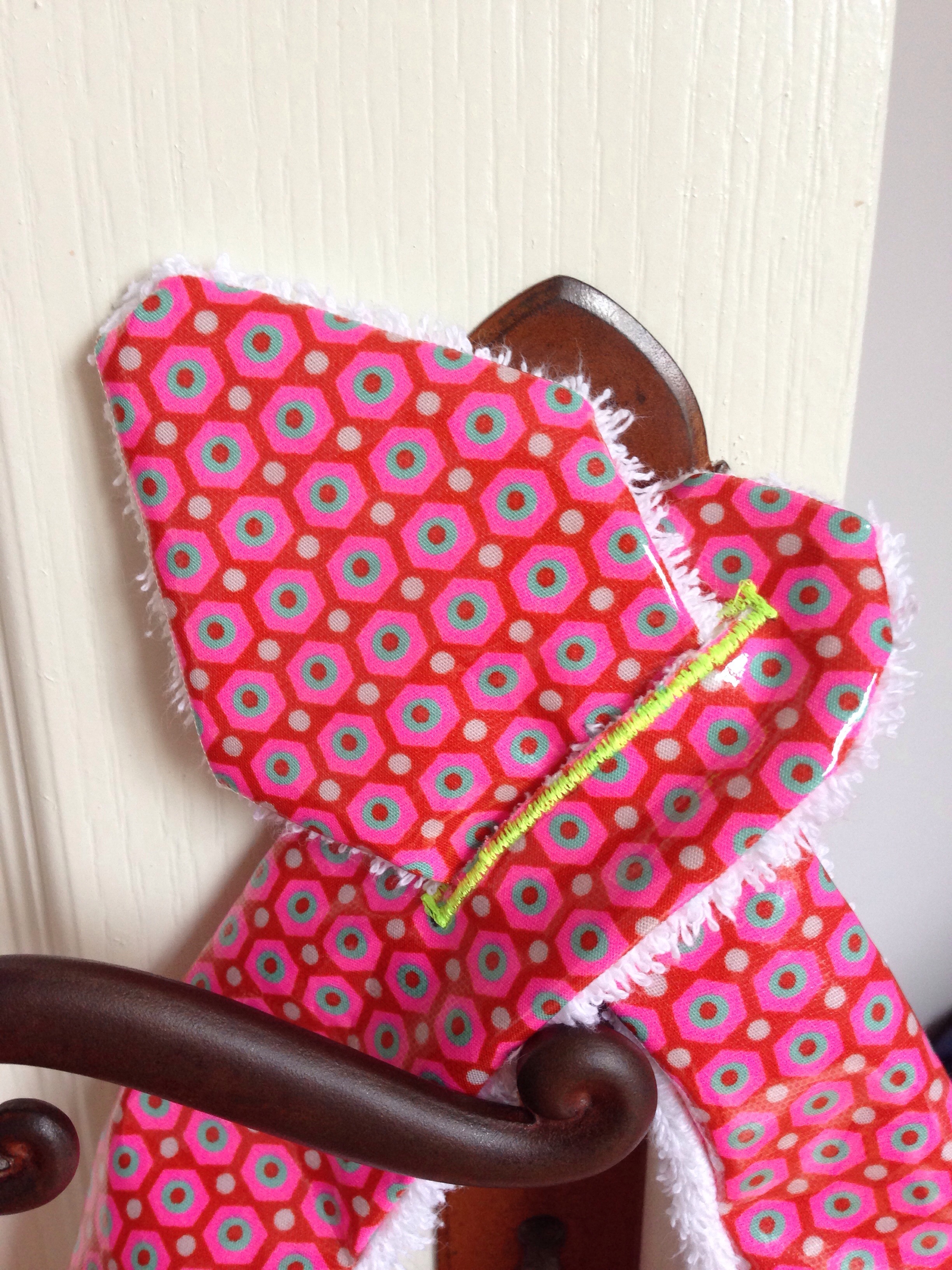 Alors comme ma chouchounette ne mange pas encore « très » correctement …. Je lui ai fait un joli bavoir, d’après le patron Vanessa Pouzet, avec, au recto, du tissu enduit Petit Pan Fluo (comme ça, un coup d’éponge sur le bavoir et il est déjà propre !!) et au verso du tissu éponge mais avec une petite fleur qui rappelle le tissu du recto !!