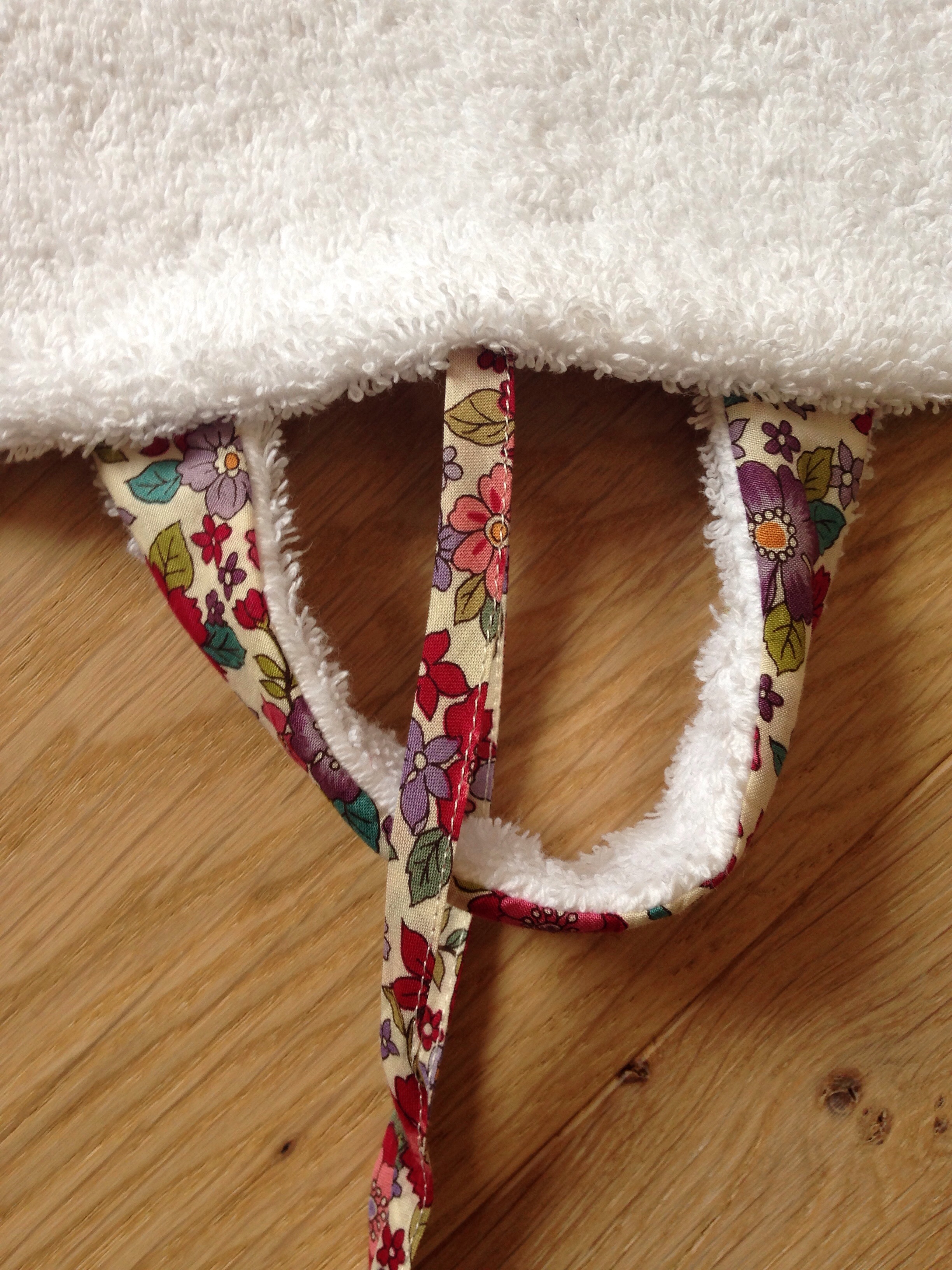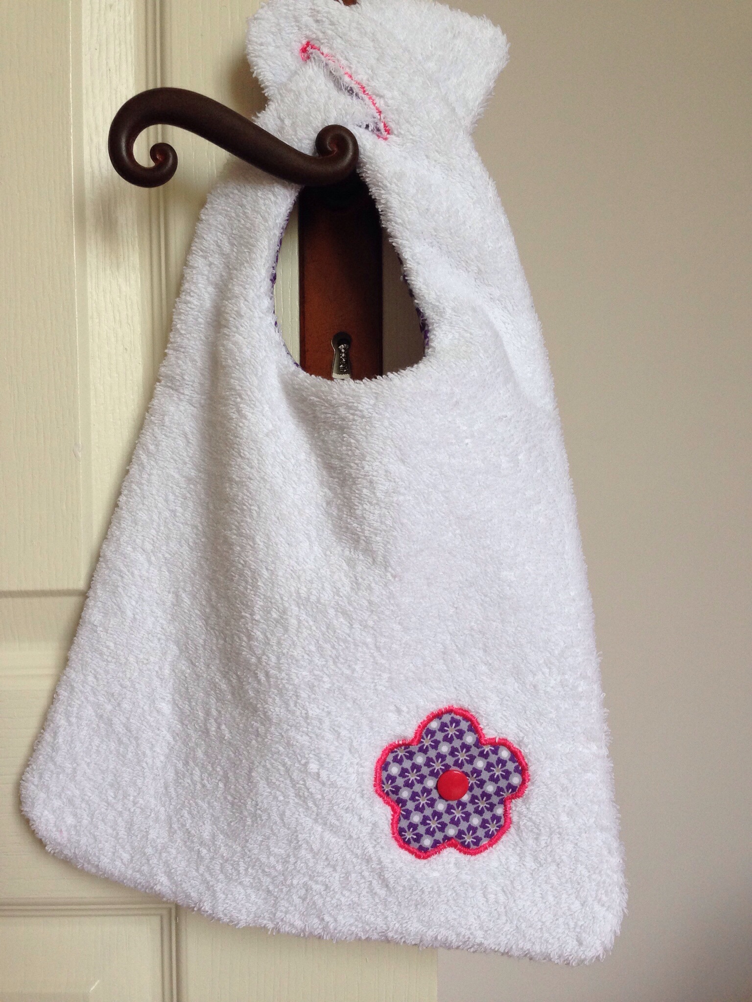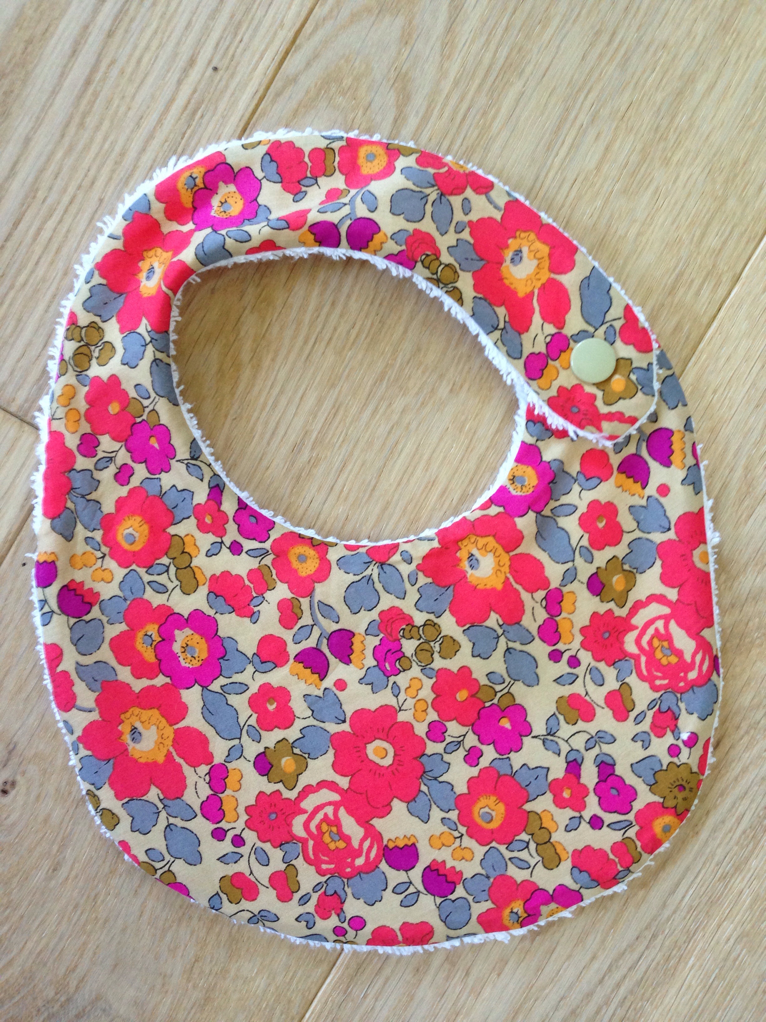 Alors comme ma chouchounette ne mange pas encore « très » correctement …. Je lui ai fait un joli bavoir, d’après le patron Vanessa Pouzet, avec, au recto, du tissu enduit Petit Pan Fluo (comme ça, un coup d’éponge sur le bavoir et il est déjà propre !!) et au verso du tissu éponge mais avec une petite fleur qui rappelle le tissu du recto !!