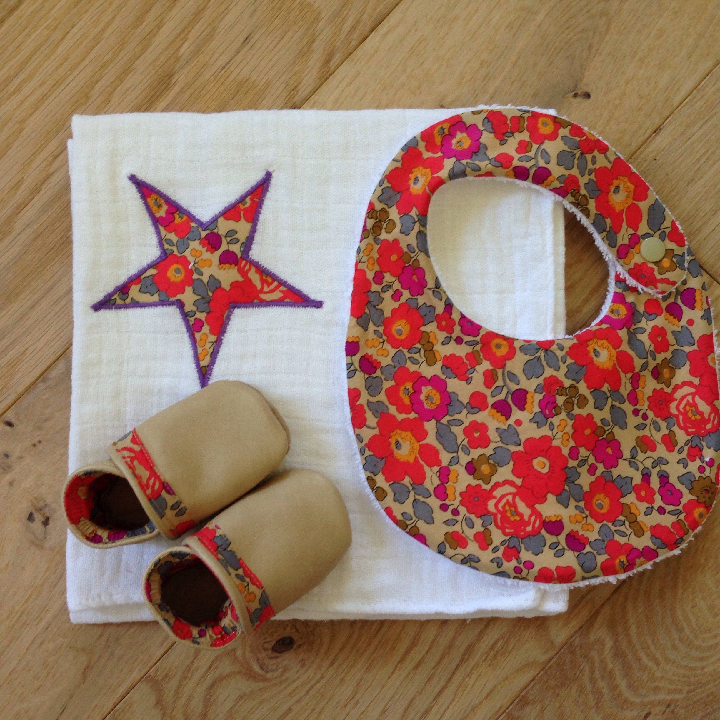 Et oui …… Encore un cadeau naissance !! On m’avait demandé une petite paire de chaussons et un bavoir assorti. Je me suis donc exécutée !!! Mais je n’ai pas pu m’empêcher de faire également un lange assorti !!!