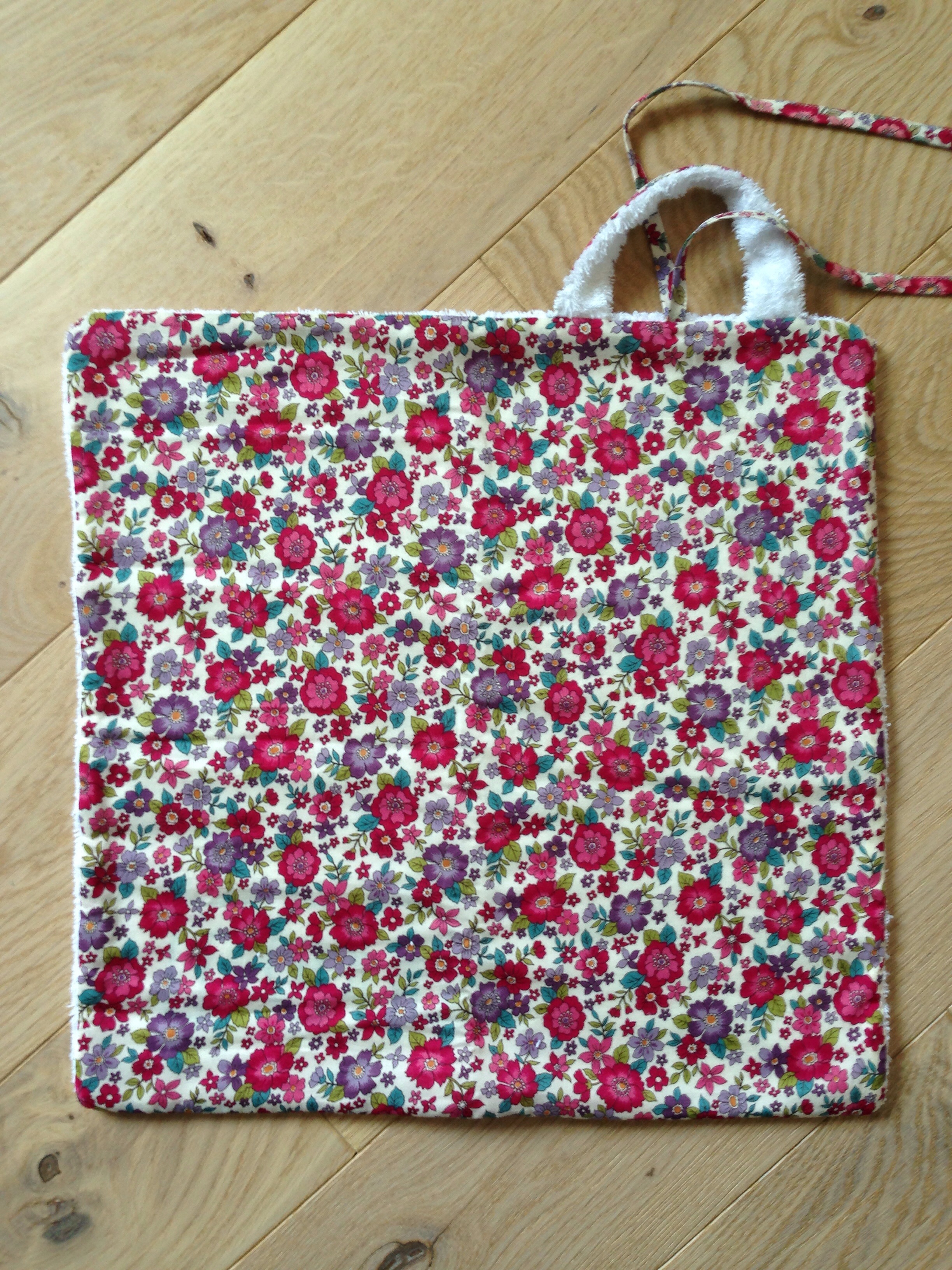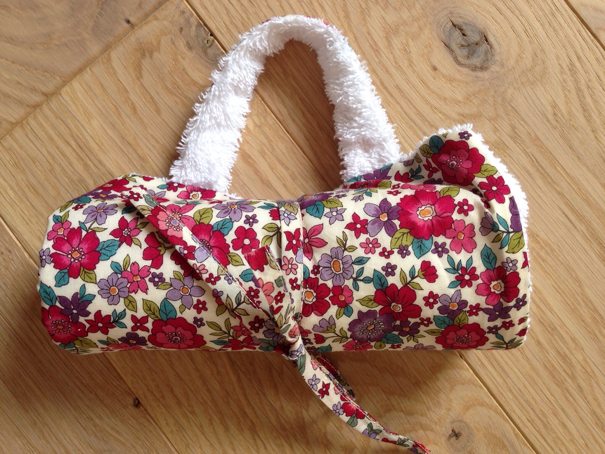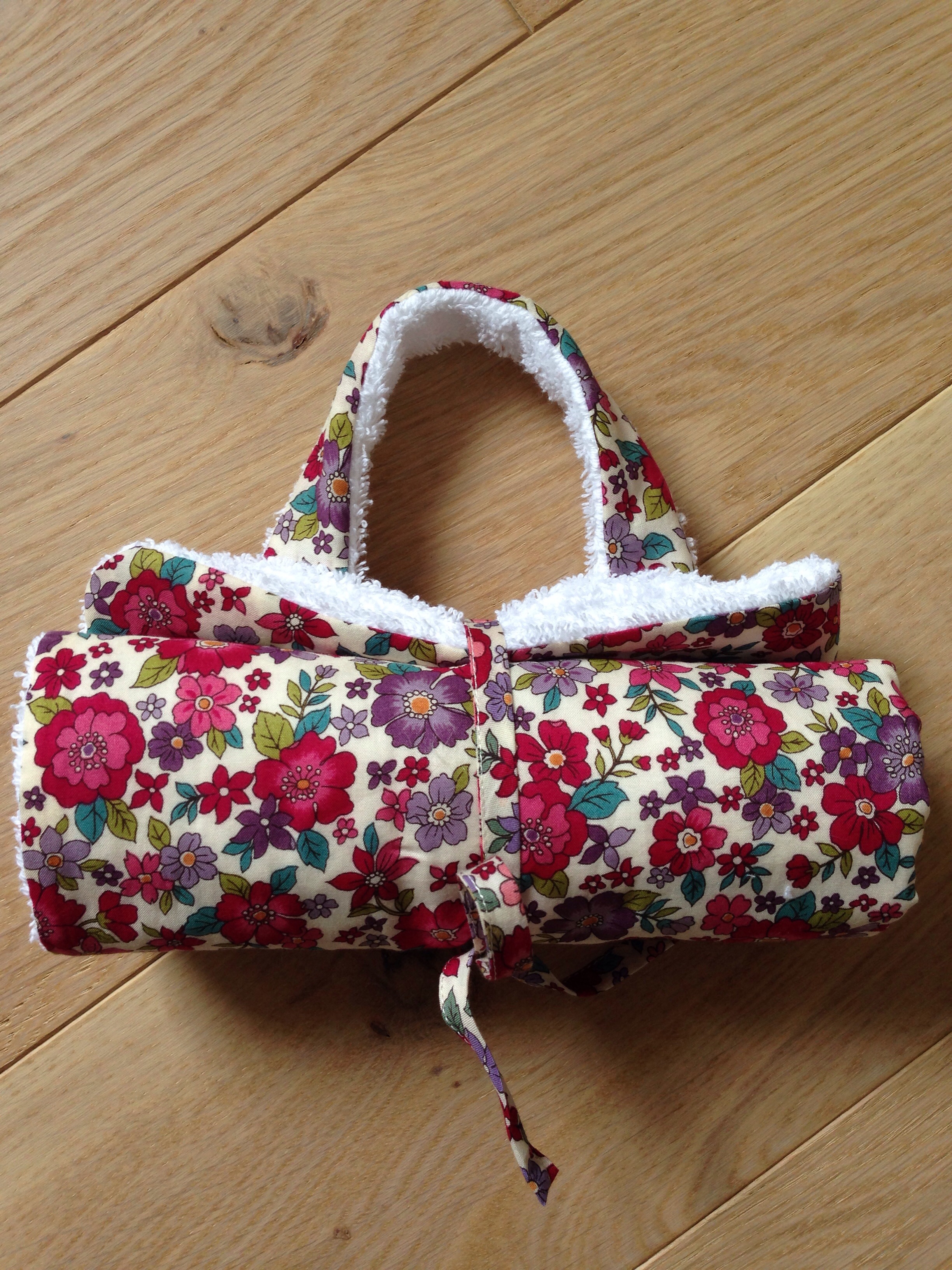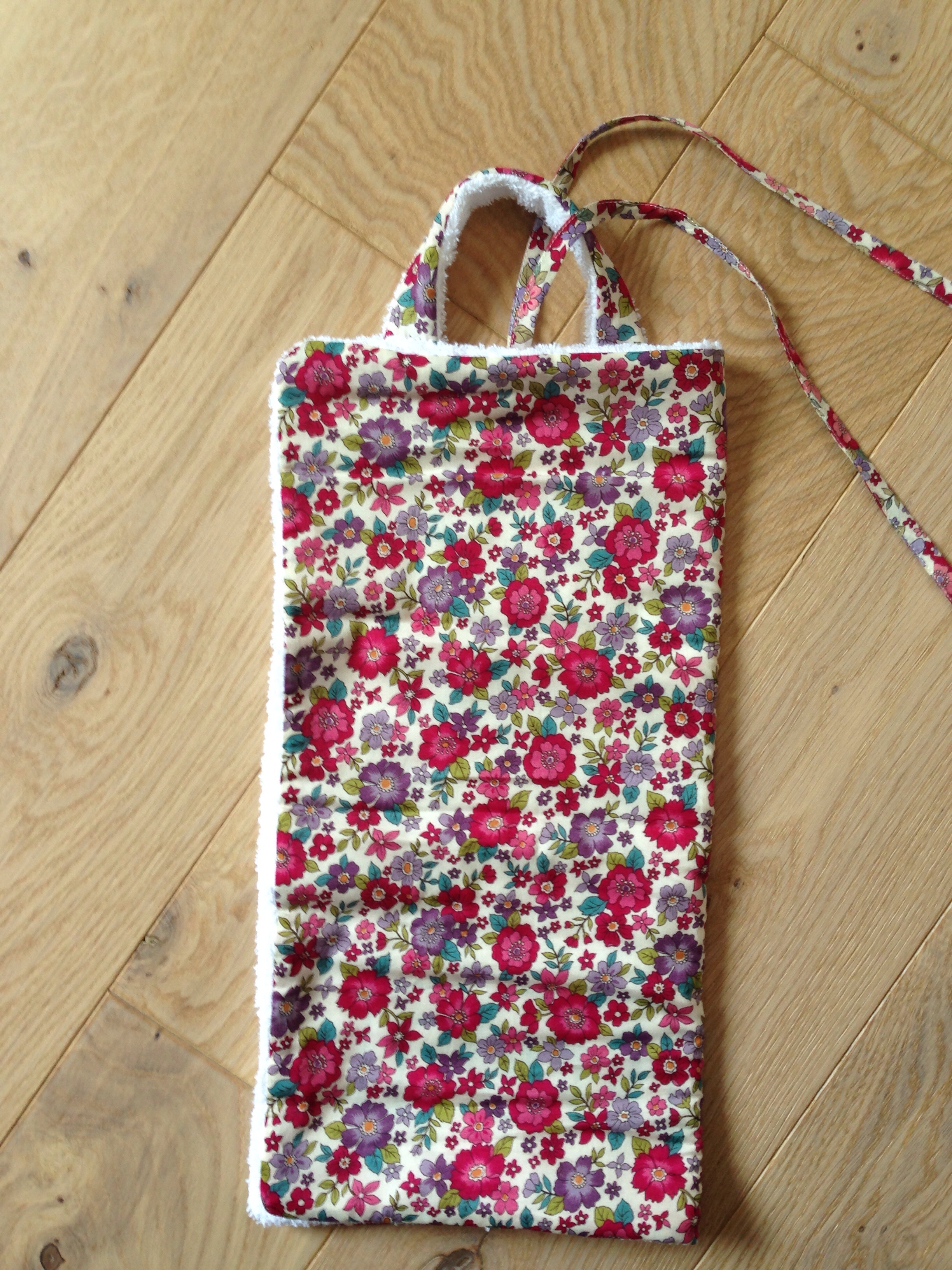 J’ai fait une petite poignée pour la transporter, car la cantine n’est pas à l’école mais dans le village, et un petit lien pour la nouer.