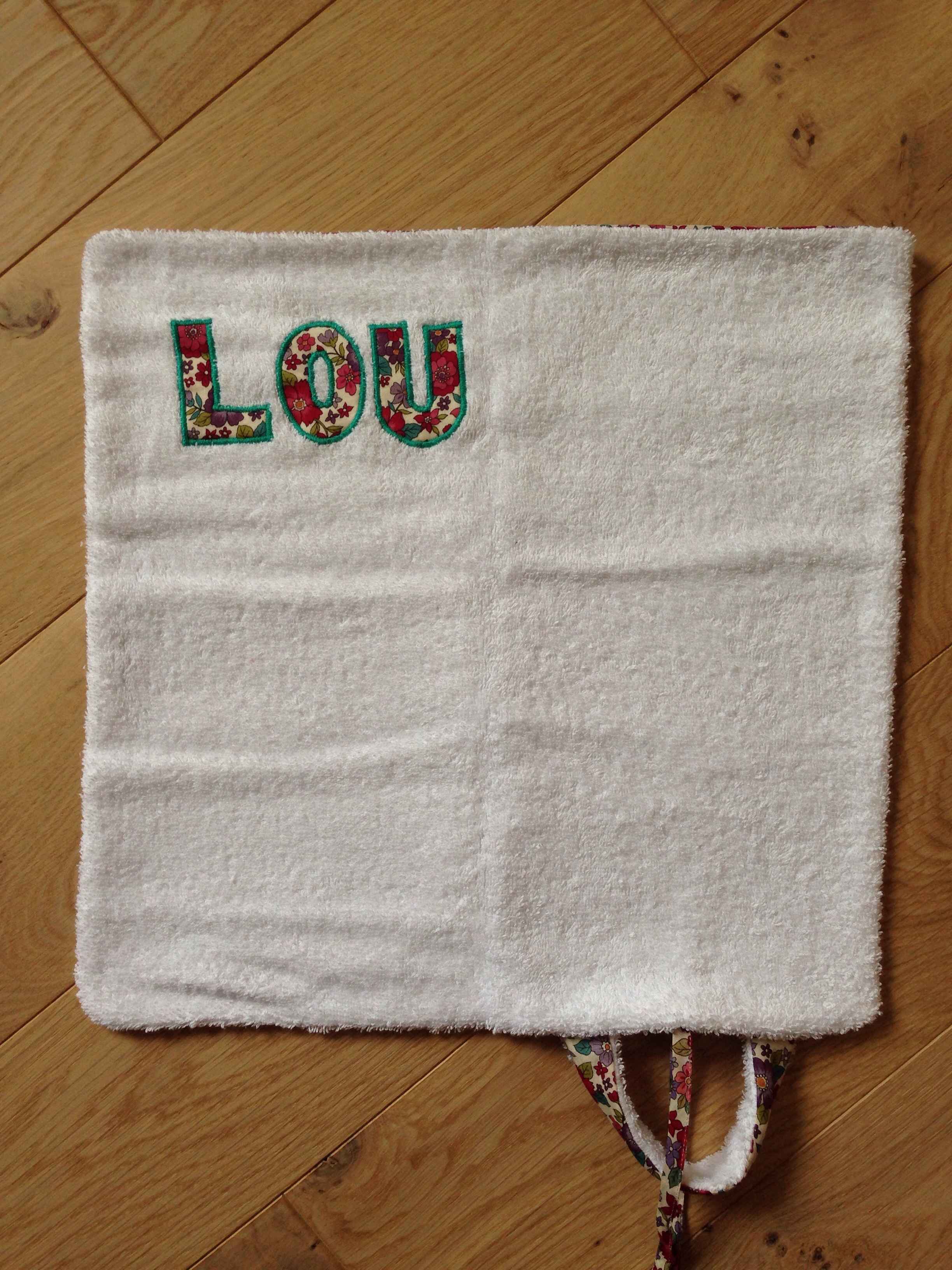 Alors je me suis dis que j’allais lui faire sa serviette ( car les enfants doivent emmener leur serviette ) : et voilà le résultat !!!