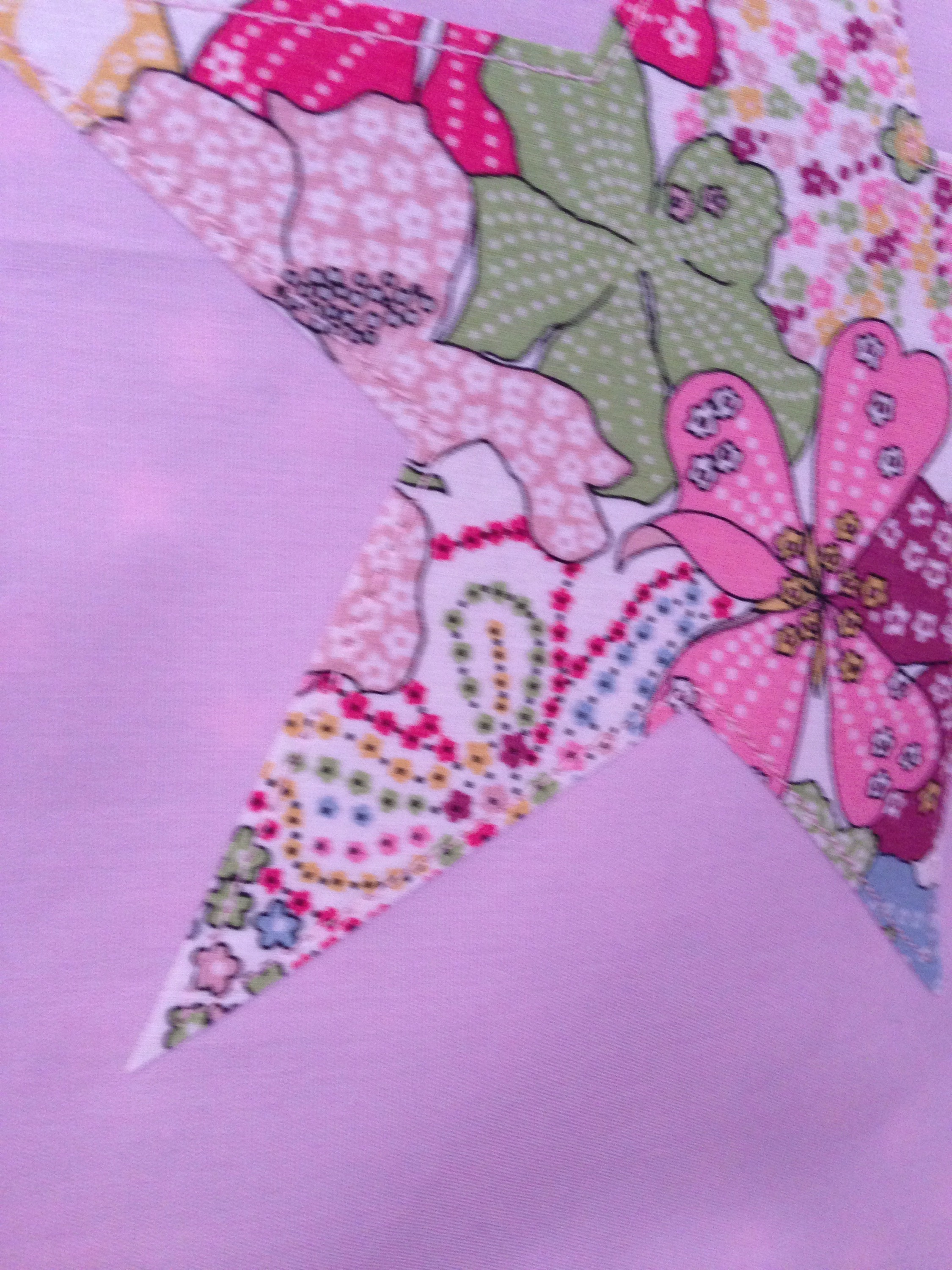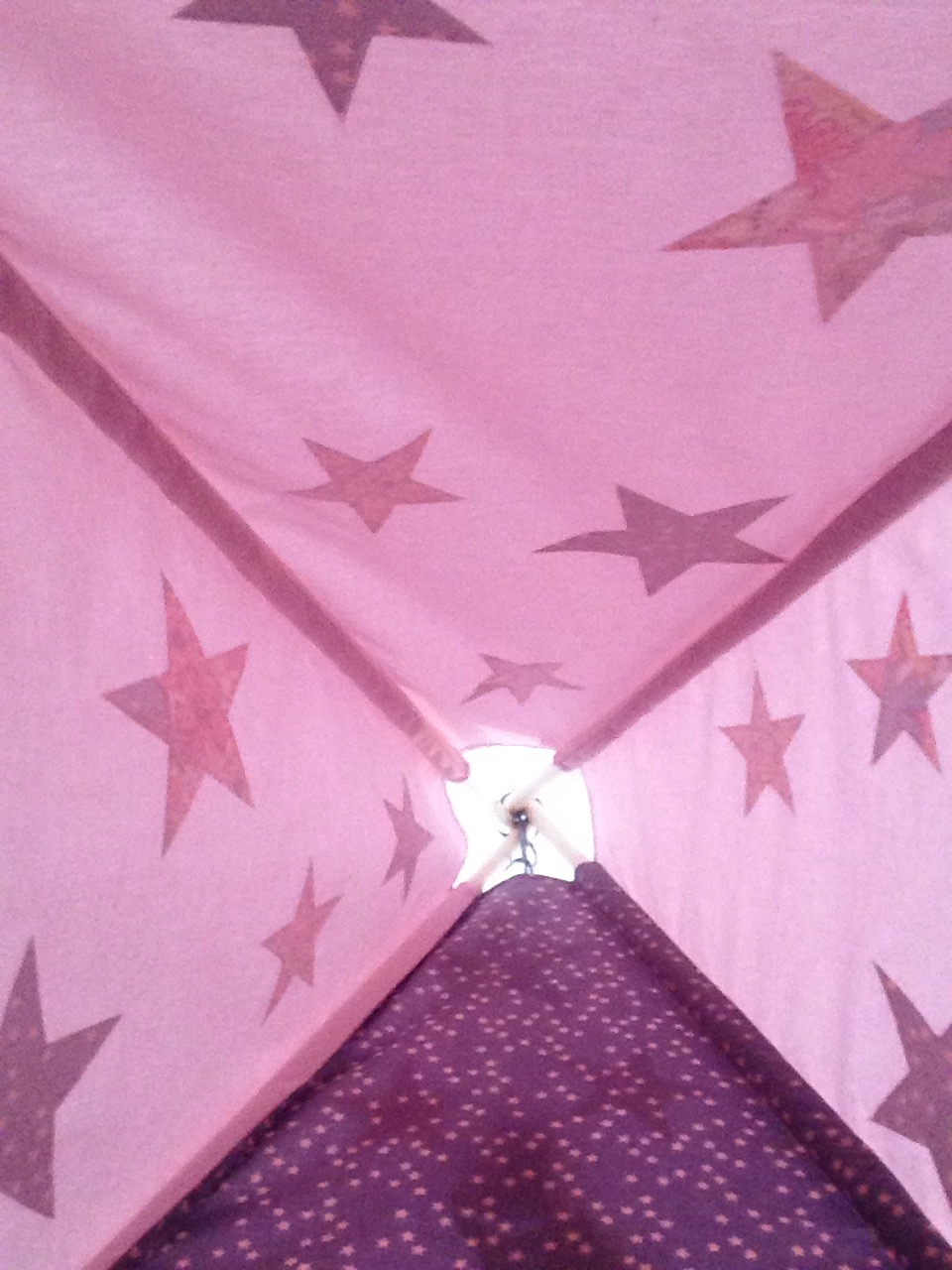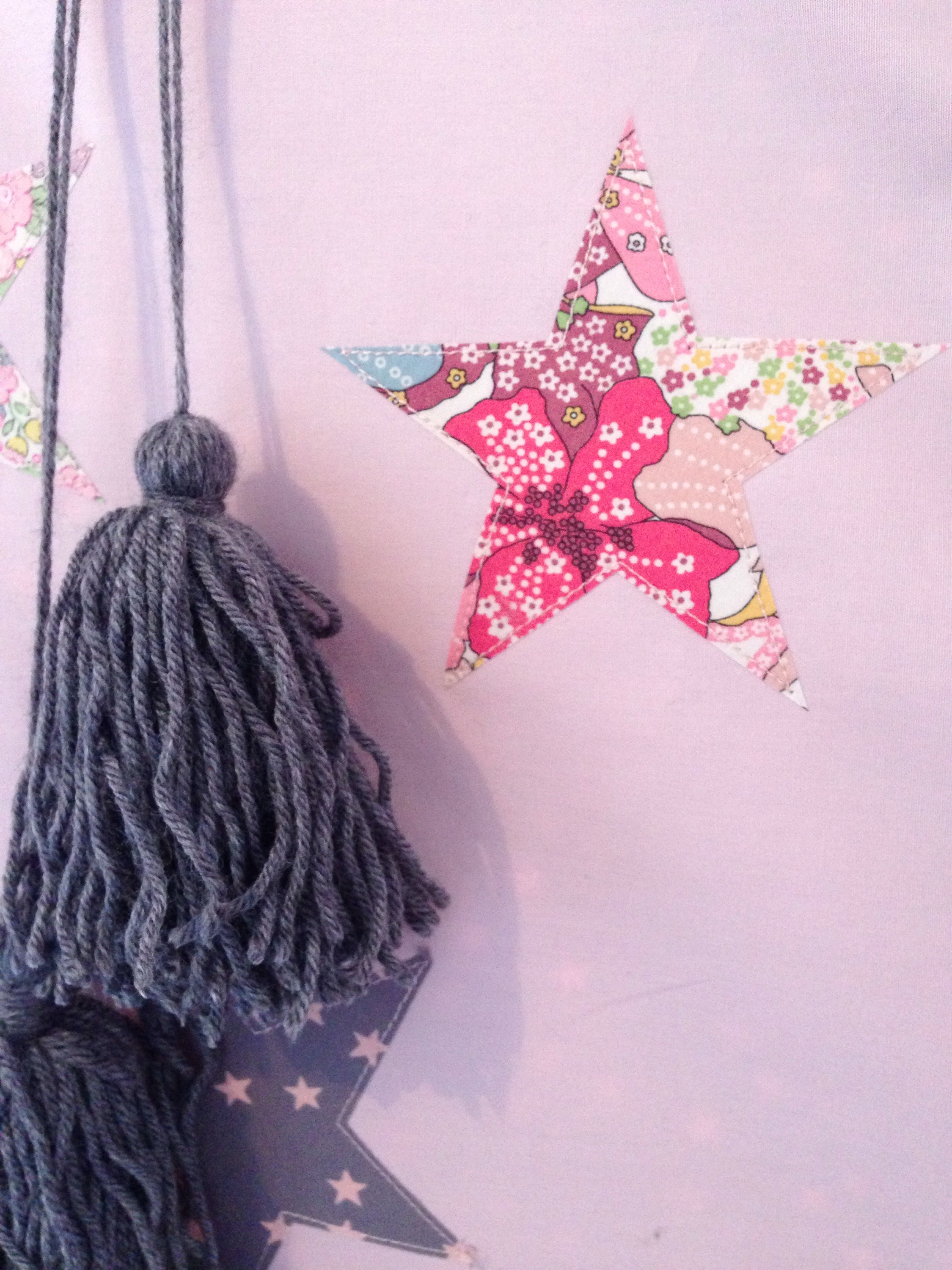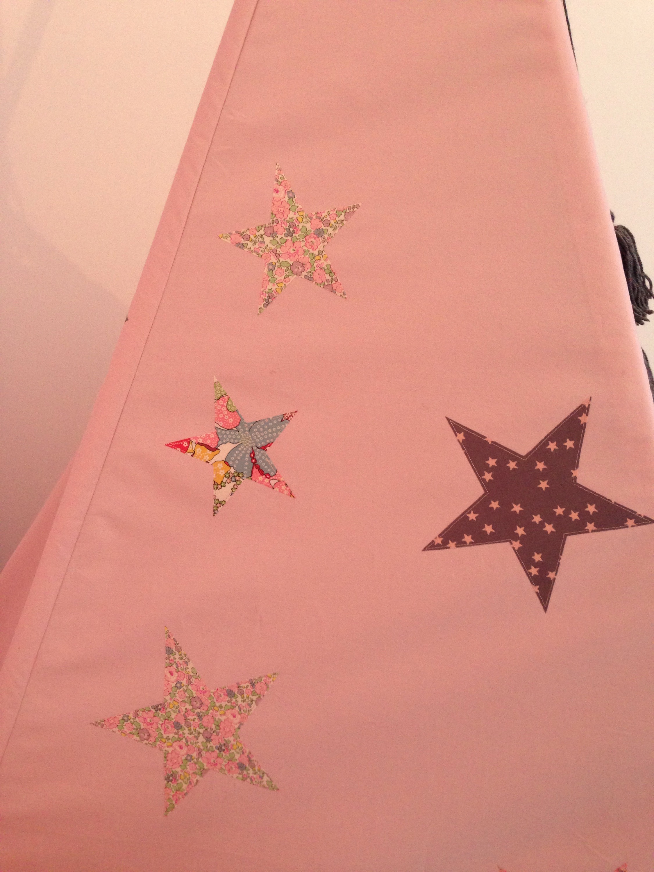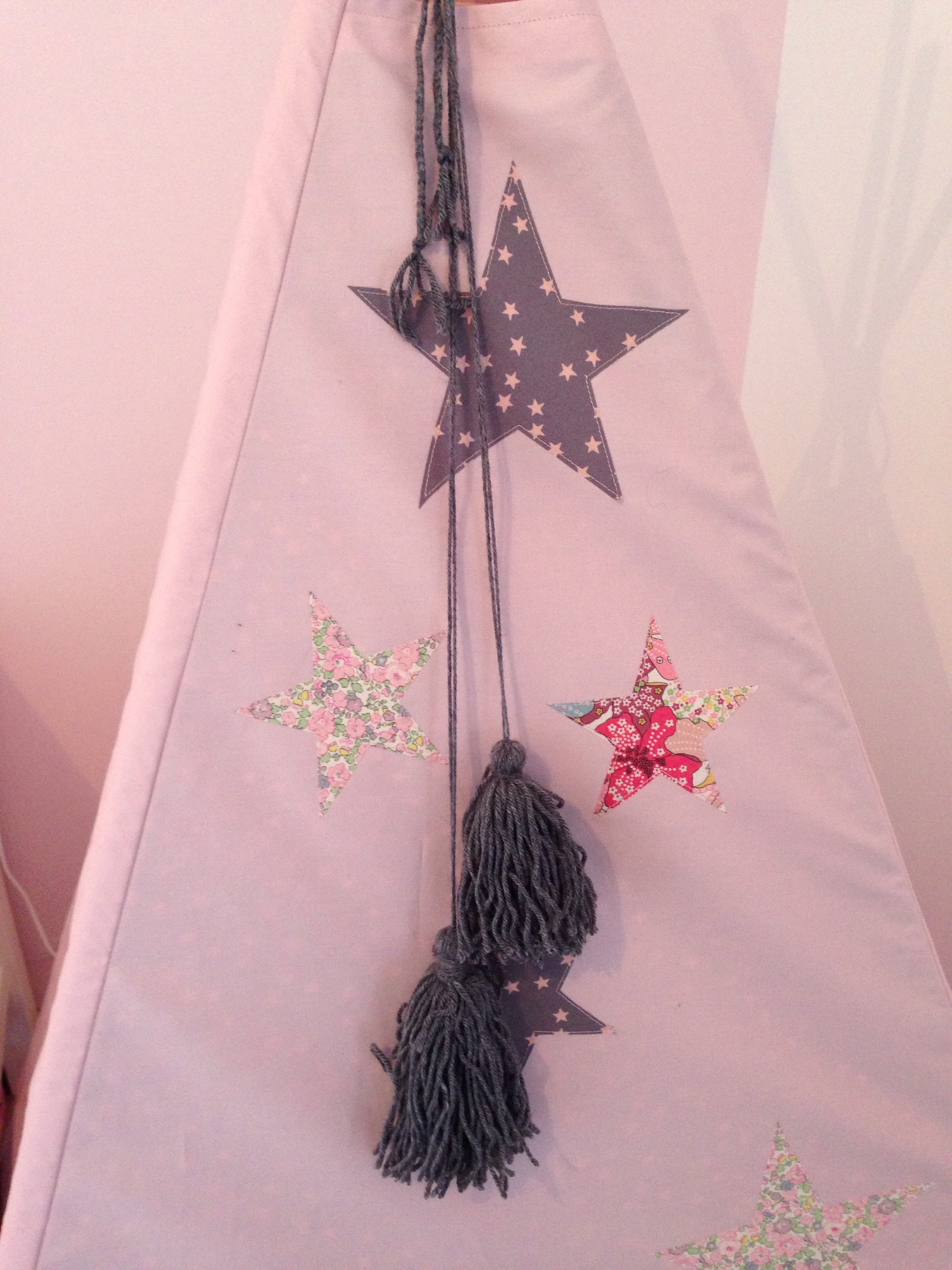 Un Tipi rose bien sûr !!! Avec des étoiles en Liberty et l’ouverture est doublée avec du tissu France Duval Stalla. Le patron est extrait du livre « Petit rien pour chambre d’enfants ».